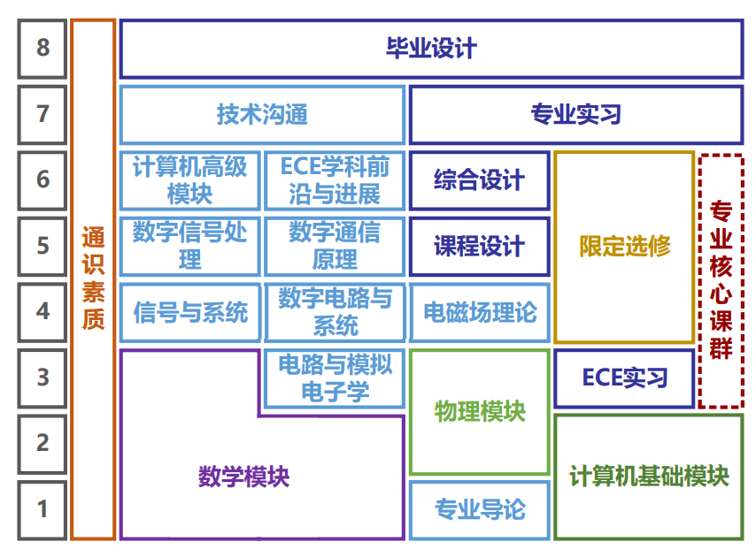 下图是“电子信息实验班”2020级的主干课程体系,大部分专业都是类似结构——公共基础课、专业必修课、专业选修课,以及体育课、公选课等。